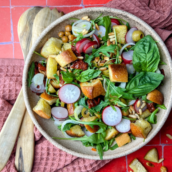 Zubereitung: 1. Den gewaschenen Rucola, die Radieschen, Oliven, Zwiebeln und die getrockneten Tomaten schneiden und in eine Schüssel geben und vermengen. 2. Für das Dressing die Zutaten gut miteinander vermengen. 3. Die Pinienkerne in einer Pfanne ohne Öl rösten und über das Gemüse streuen. 4. Das Baguette in mundgerechte Würfel schneiden und das Öl in einer Pfanne erhitzen. Die Brotstücke, die Kichererbsen sowie Knoblauch und Salz in die Pfanne geben und für ca. 10 Minuten rösten. 5. Alle Zutaten für den Brotsalat gleichmässig vermengen und anschliessend das Dressing darüber verteilen. |