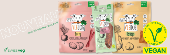 Enfin, nous te présentons une nouveauté maintenant disponible en Suisse : une gamme de produits certifiée V-Label pour les chiens.